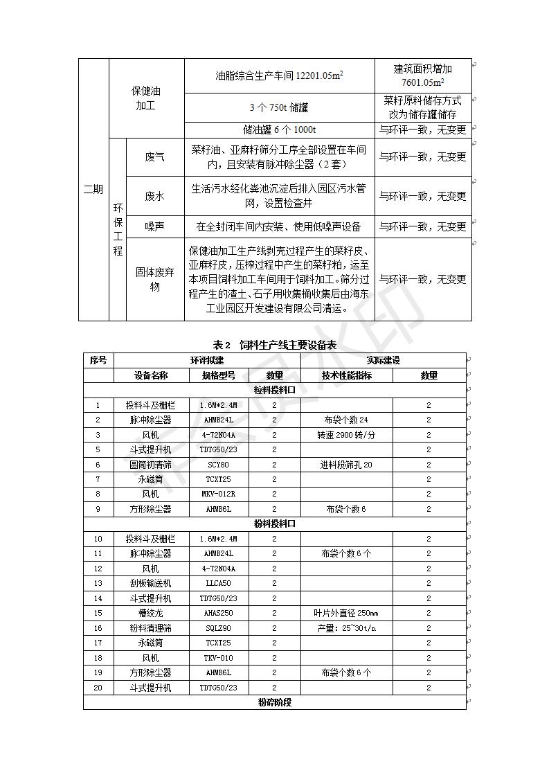 四、建設內容:根據環(huán)境影響報告表及批復,本項目總占地面積117199.6m2,一期建設20萬噸牛羊精補飼料加工倉儲建設、二期建設5萬噸高端特色食用保健油項目、三期建設2萬噸食品加工。本次驗收對項目一期、二期進行核查,項目建設內容與規(guī)模為:項目總占地面積為117199.6m2,總建設面積為32000m2,包括油脂綜合車間、畜禽料車間、反芻料車間、飼料成品庫、飼料原料庫、油泵房、鍋爐房、配電室和消防蓄水池等。