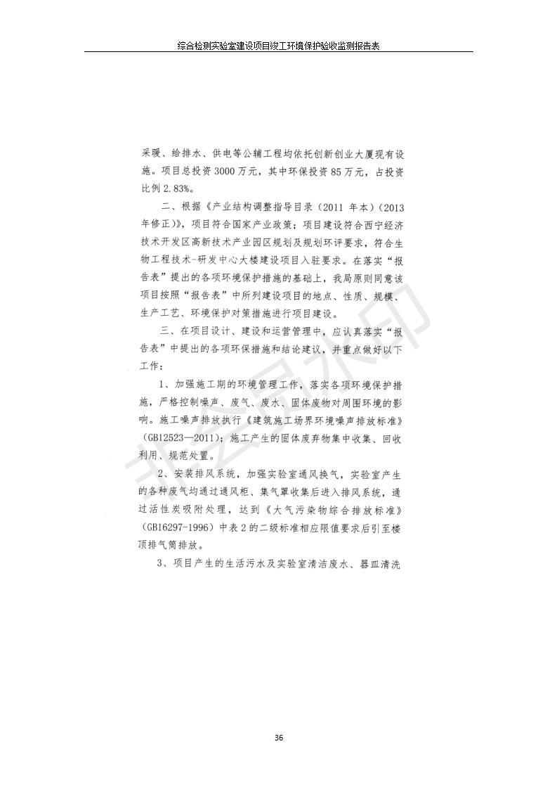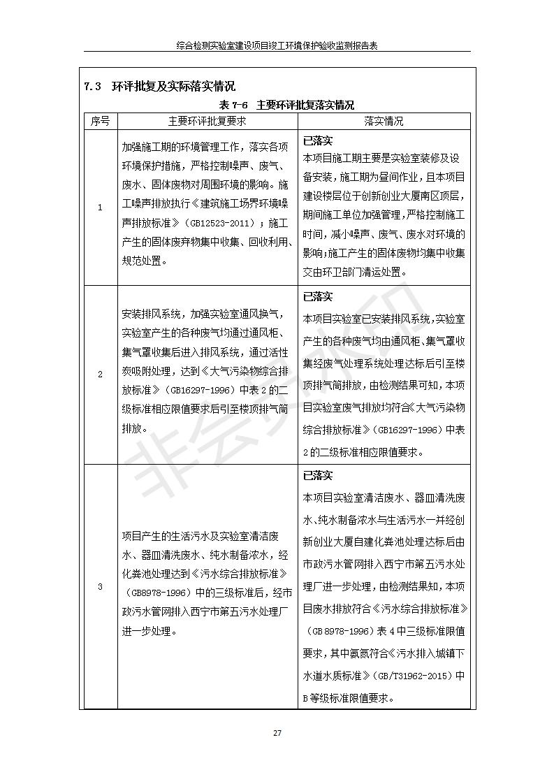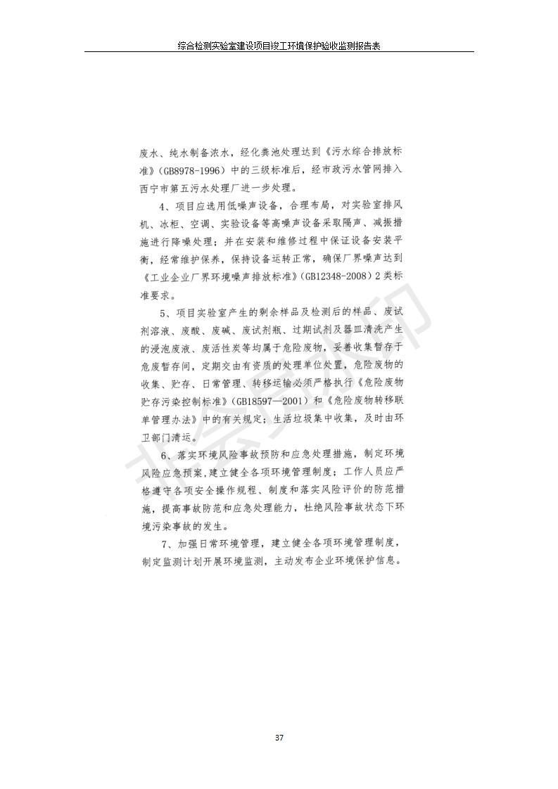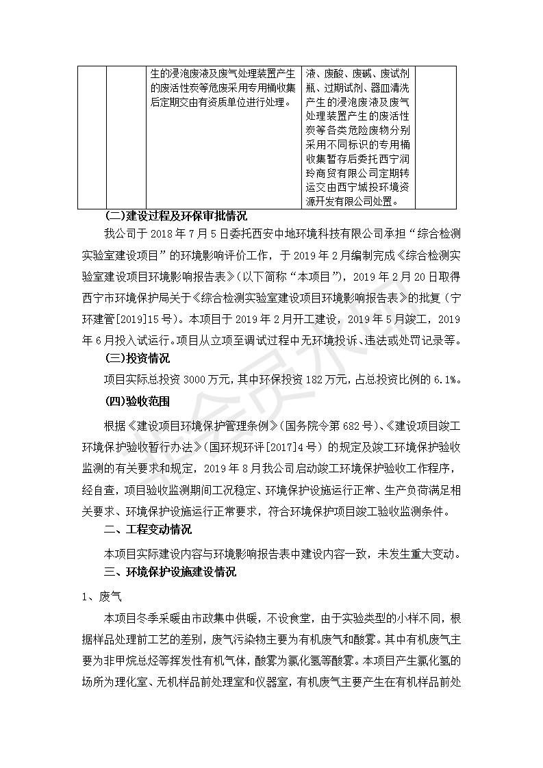 根據(jù)中華人民共和國國務院令第682號《國務院關于修改〈建設項目環(huán)境保護管理條例〉的決定》和《建設項目竣工環(huán)境保護驗收暫行辦法》(國務院令682號),綜合檢測實驗室建設項目(包括竣工環(huán)境保護驗收監(jiān)測報告表和驗收意見)公示如下。 一、項目名稱:綜合檢測實驗室建設項目 二、地點:西寧市經(jīng)濟技術開發(fā)區(qū)生物科技產(chǎn)業(yè)園區(qū)創(chuàng)新創(chuàng)業(yè)大廈南區(qū)15、16層 六、聯(lián)系電話:0971-6515411 七、公示時間:二〇一九年十一月十九日至二〇一九年十二月十六日 公示期間,對上述公示內(nèi)容如有異議,請以書面形式反饋,個人須署真實姓名,單位須加蓋公章。