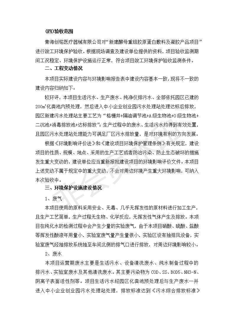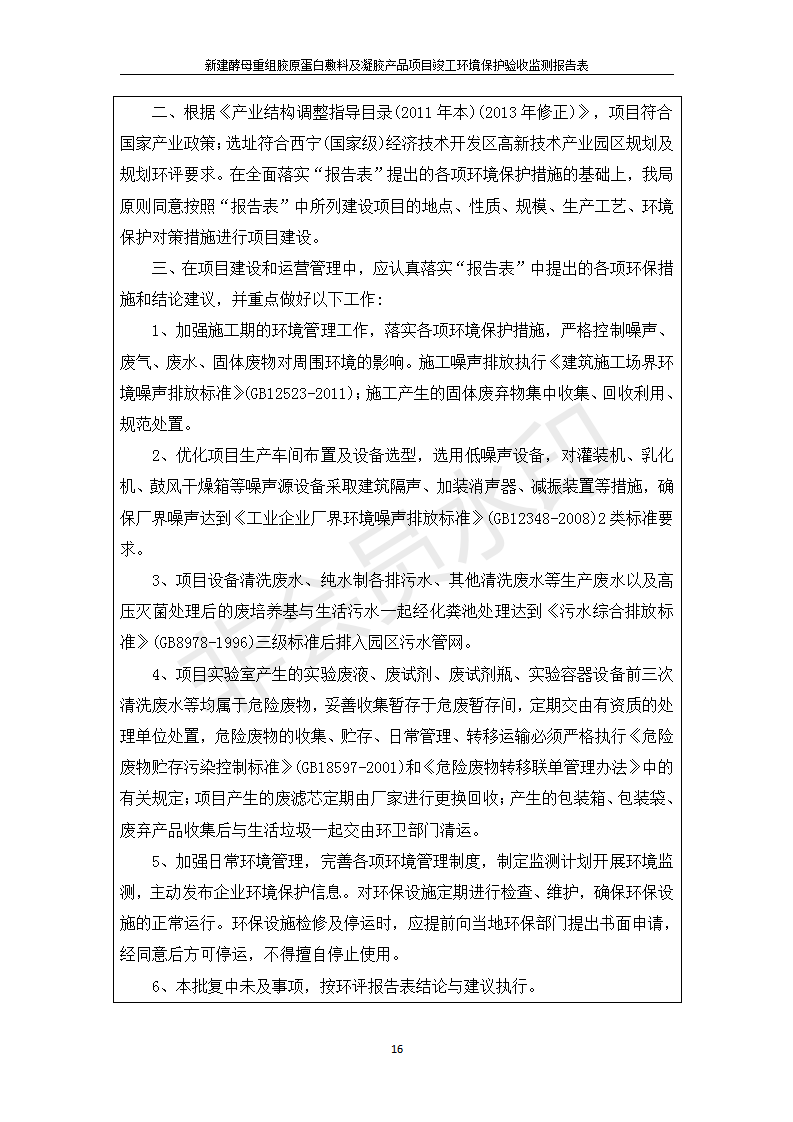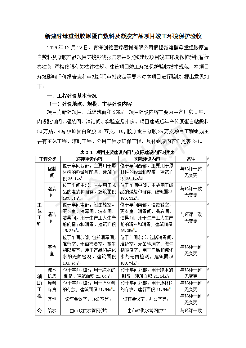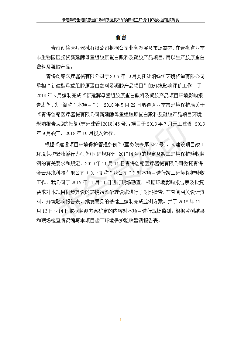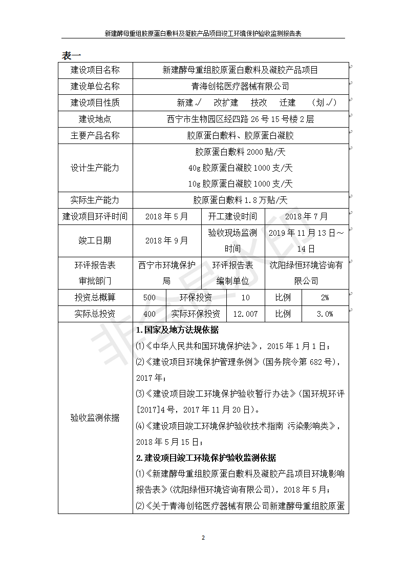 根據(jù)中華人民共和國國務院令第682號《國務院關(guān)于修改〈建設項目環(huán)境保護管理條例〉的決定》和《建設項目竣工環(huán)境保護驗收暫行辦法》(國務院令682號),新建酵母重組膠原蛋白敷料及凝膠產(chǎn)品項目(包括竣工環(huán)境保護驗收監(jiān)測報告表和驗收意見)公示如下。