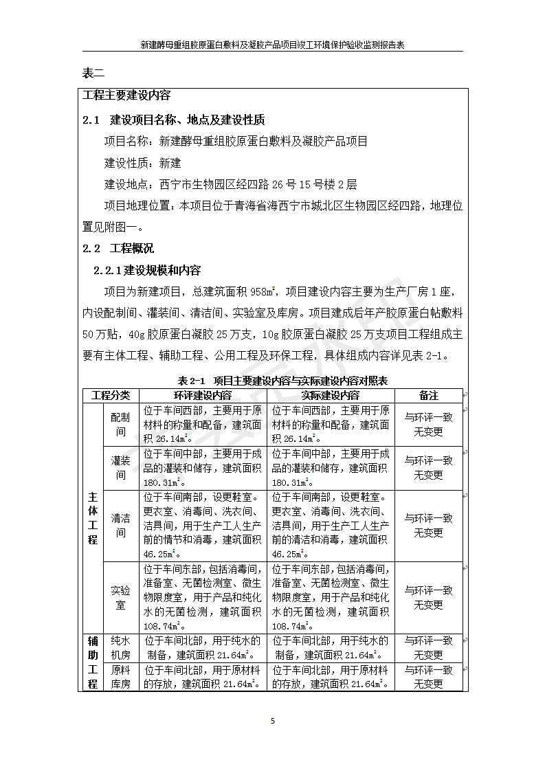 四、建設內(nèi)容:項目為新建項目,總建筑面積958m2,項目建設內(nèi)容主要為生產(chǎn)廠房1座,內(nèi)設配制間、灌裝間、清潔間、實驗室及庫房。項目建成后年產(chǎn)膠原蛋白帖敷料50萬貼,40g膠原蛋白凝膠25萬支,10g膠原蛋白凝膠25萬支項目工程組成主要有主體工程、輔助工程、公用工程及環(huán)保工程