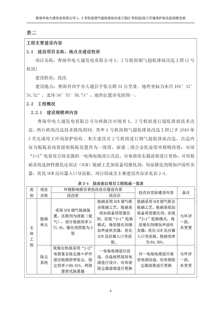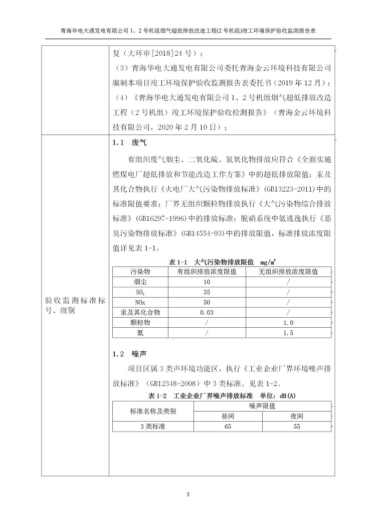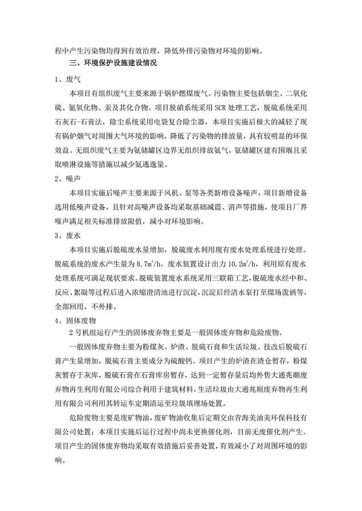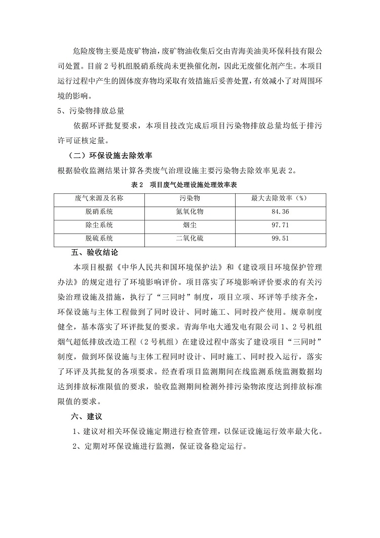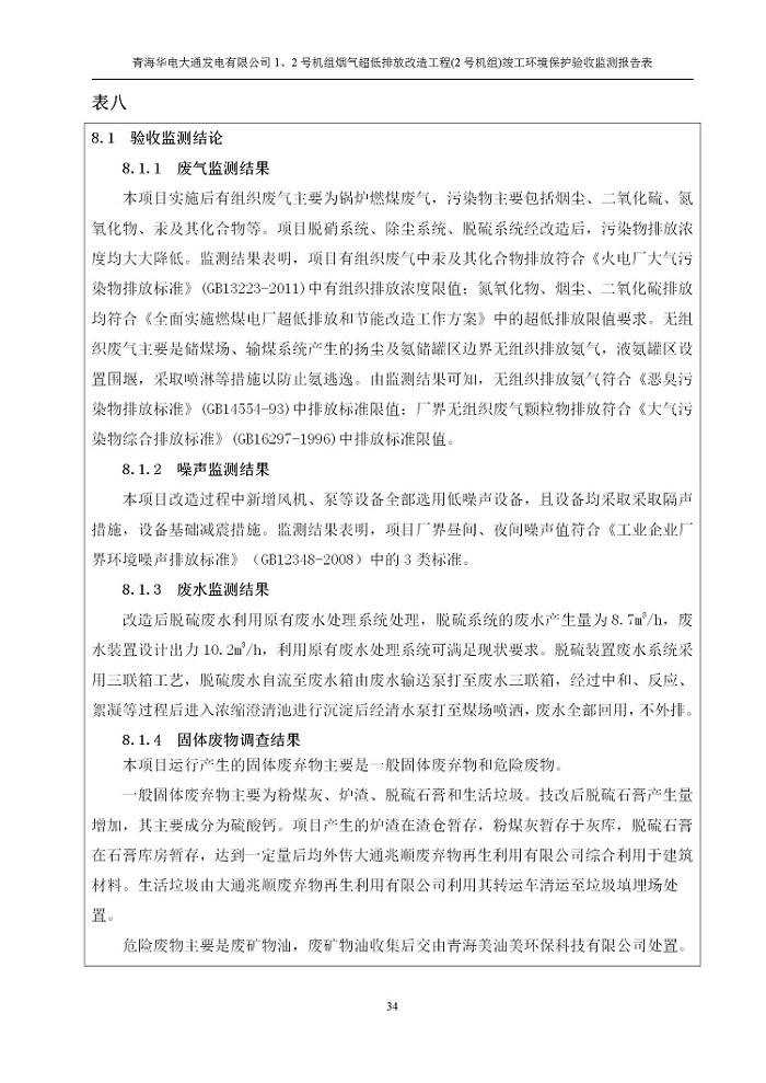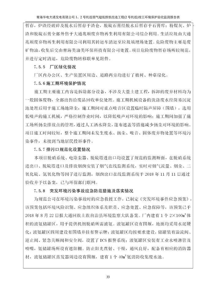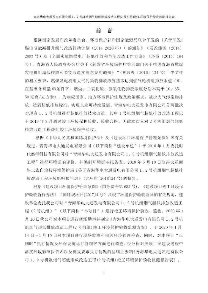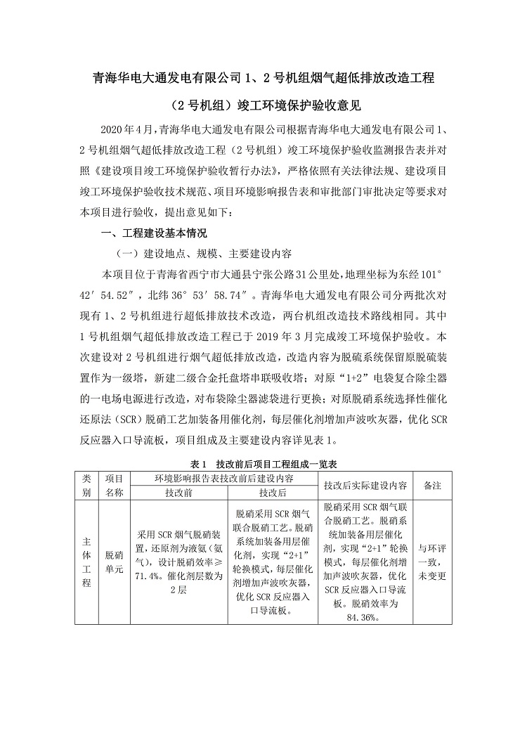 根據(jù)中華人民共和國國務院令第682號《國務院關于修改〈建設項目環(huán)境保護管理條例〉的決定》和《建設項目竣工環(huán)境保護驗收暫行辦法》(國務院令682號),青海華電大通發(fā)電有限公司1、2號機組煙氣超低排放改造工程(2號機組) (包括竣工環(huán)境保護驗收監(jiān)測報告表和驗收意見)公示如下。 一、項目名稱:青海華電大通發(fā)電有限公司1、2號機組煙氣超低排放改造工程(2號機組) 竣工環(huán)境保護驗收監(jiān)測報告表 二、地點:青海省西寧市大通縣寧張公路31公里處 三、建設單位:青海華電大通發(fā)電有限公司 四、建設內容:2號機組煙氣超低排放改造,2號機組改造內容為脫硫系統(tǒng)保留原脫硫裝置作為一級塔,新建二級合金托盤塔串聯(lián)吸收塔;對原“1+2”電袋復合除塵器的一電場電源進行改造,對布袋除塵器濾袋進行更換;對原脫硝系統(tǒng)選擇性催化還原法(SCR)脫硝工藝加裝備用催化劑,每層催化劑增加聲波吹灰器,優(yōu)化SCR反應器入口導流板。 五、聯(lián)系人:馬世敏 六、聯(lián)系電 話:0971-6515411 七、公示時間:二〇二〇年四月二十九日至二〇二〇年五月二十八日 公示期間,對上述公示內容如有異議,請以書面形式反饋,個人須署真實姓名,單位須加蓋公章。