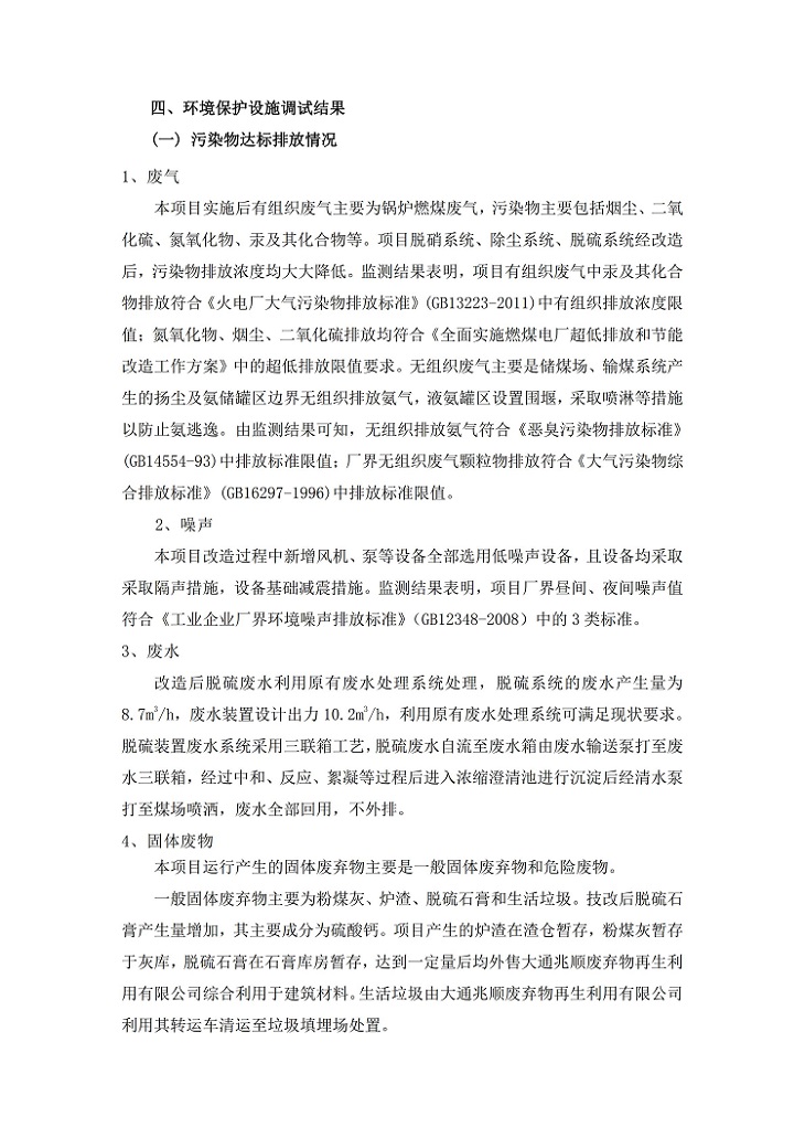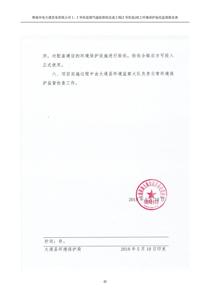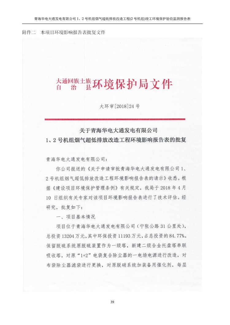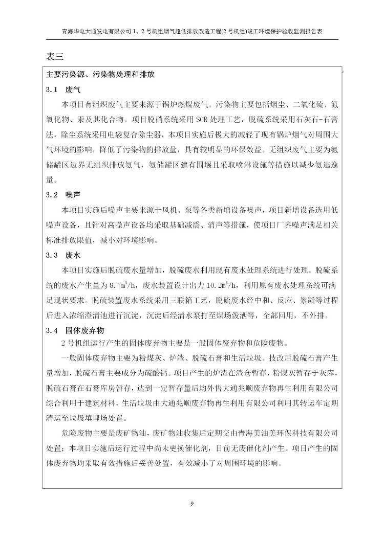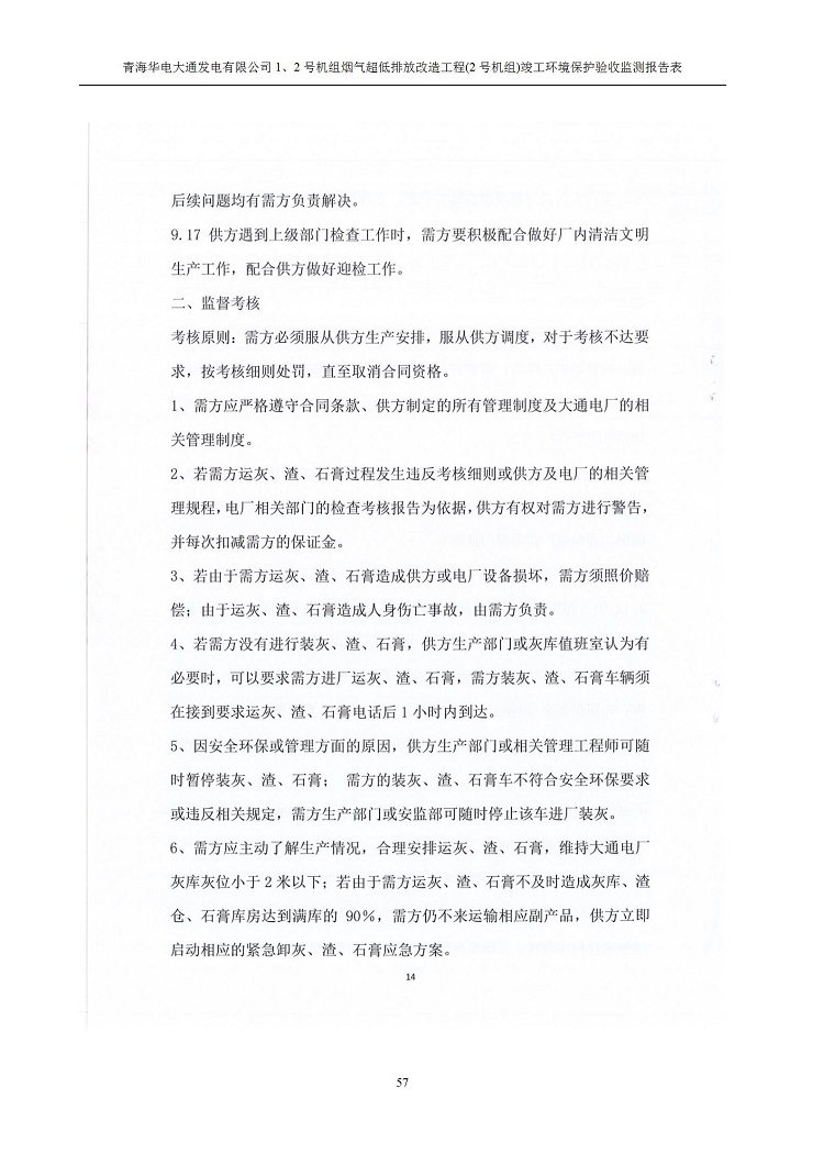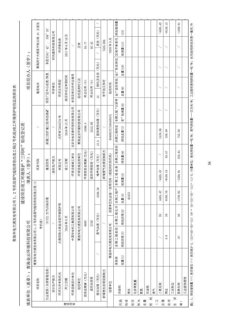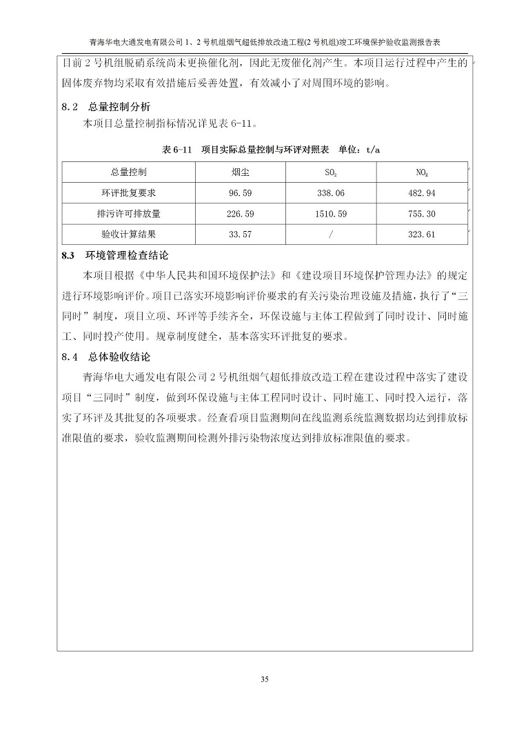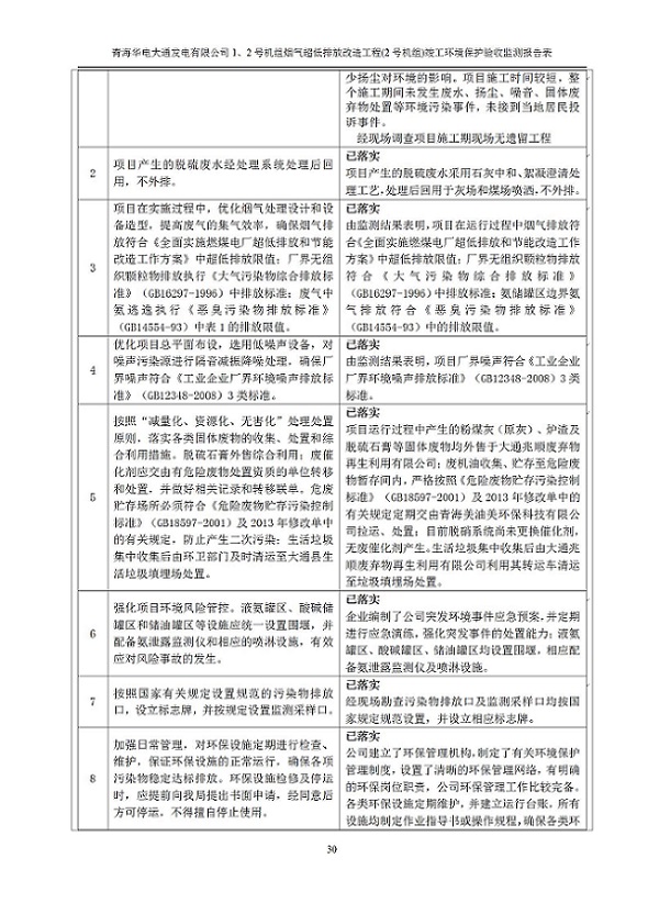 根據(jù)中華人民共和國國務院令第682號《國務院關于修改〈建設項目環(huán)境保護管理條例〉的決定》和《建設項目竣工環(huán)境保護驗收暫行辦法》(國務院令682號),青海華電大通發(fā)電有限公司1、2號機組煙氣超低排放改造工程(2號機組) (包括竣工環(huán)境保護驗收監(jiān)測報告表和驗收意見)公示如下。 一、項目名稱:青海華電大通發(fā)電有限公司1、2號機組煙氣超低排放改造工程(2號機組) 竣工環(huán)境保護驗收監(jiān)測報告表 二、地點:青海省西寧市大通縣寧張公路31公里處 三、建設單位:青海華電大通發(fā)電有限公司 四、建設內容:2號機組煙氣超低排放改造,2號機組改造內容為脫硫系統(tǒng)保留原脫硫裝置作為一級塔,新建二級合金托盤塔串聯(lián)吸收塔;對原“1+2”電袋復合除塵器的一電場電源進行改造,對布袋除塵器濾袋進行更換;對原脫硝系統(tǒng)選擇性催化還原法(SCR)脫硝工藝加裝備用催化劑,每層催化劑增加聲波吹灰器,優(yōu)化SCR反應器入口導流板。 五、聯(lián)系人:馬世敏 六、聯(lián)系電 話:0971-6515411 七、公示時間:二〇二〇年四月二十九日至二〇二〇年五月二十八日 公示期間,對上述公示內容如有異議,請以書面形式反饋,個人須署真實姓名,單位須加蓋公章。